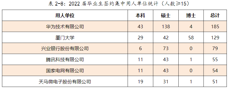 就业流向:2022届本科和硕士毕业生到企业(包括其他企业、国有企业)就业比例最高,签约行业主要集中在信息传输、软件和信息技术服务业、制造业、金融业。