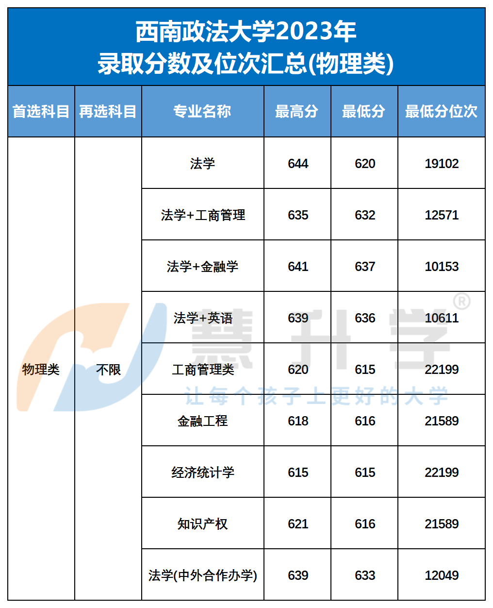 从上图可以看出,选考物理,录取分最高的专业是法学,分数644分,位次排名7265。