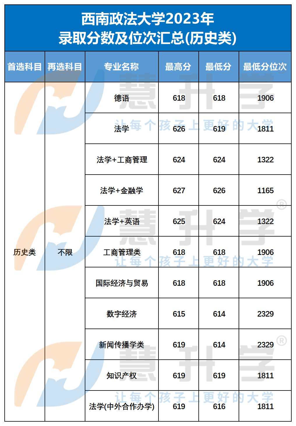从上图可以看出,选考历史,录取分最高的专业是法学+金融学,分数627分,位次排名1080。
