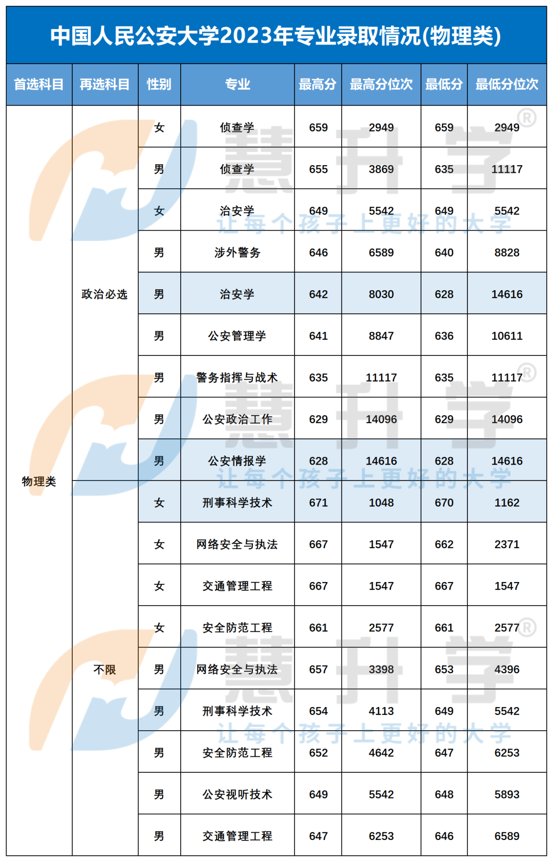 从上图可以看出,选考物理,录取分最高的专业是刑事科学技术(女),分数是671分,位次排名1048。
