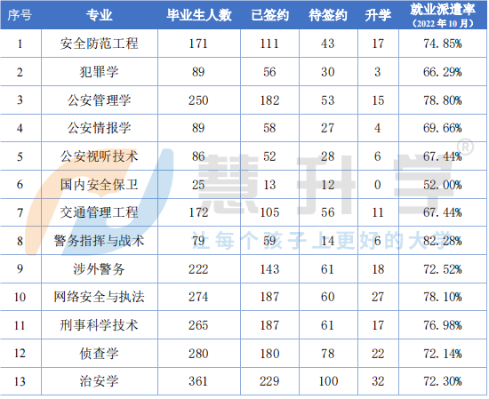 截至2022年10月,学校2022届本科毕业生中,有1562人签约,178人升学,就业派遣率达到73.64%。623名毕业生未办理就业派遣手续,经调查,其中近8成毕业生已通过公安院校招警统考落实工作尚未派遣,其余会继续通过参加各级公务员、事业单位考试以及考研升学等方式陆续就业。