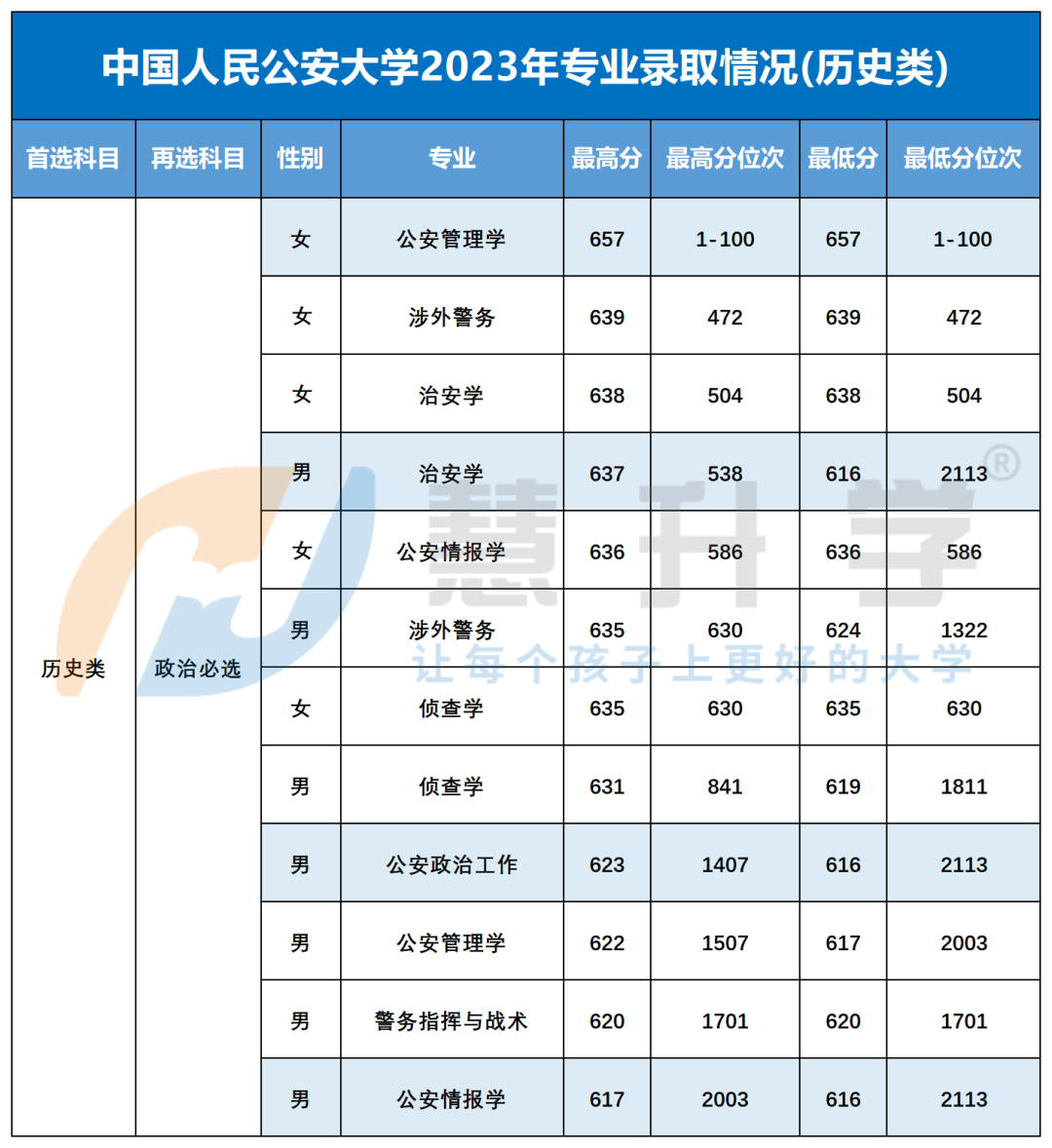 从上图可以看出,选考历史,录取分最高的专业是公安管理学(女),分数是657分,位次排名前100。