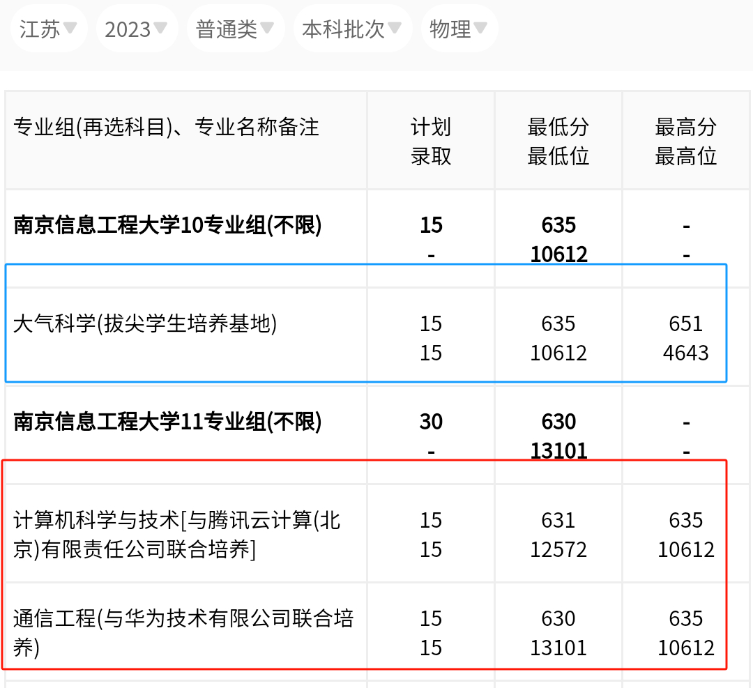 以2023年为例,腾讯、华为实验班的最低录取分仅次于王牌专业大气科学(基地班)。