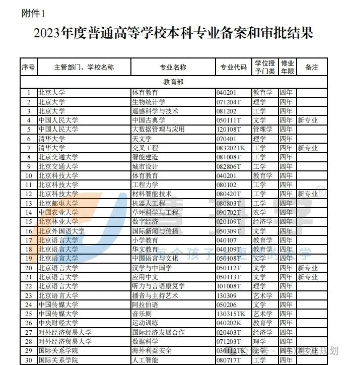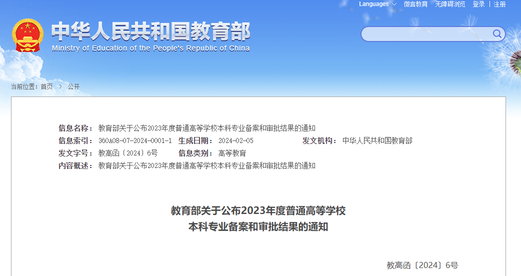 日前,教育部公布了2023年度普通高等学校本科专业备案和审批结果。其中备案、审批和调整的专业,将列入相关高校2024年本科招生计划。