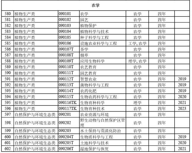 农学门类下有植物生产、自然保护与环境生态、动物生产、动物医学、林学、水产、草学等。