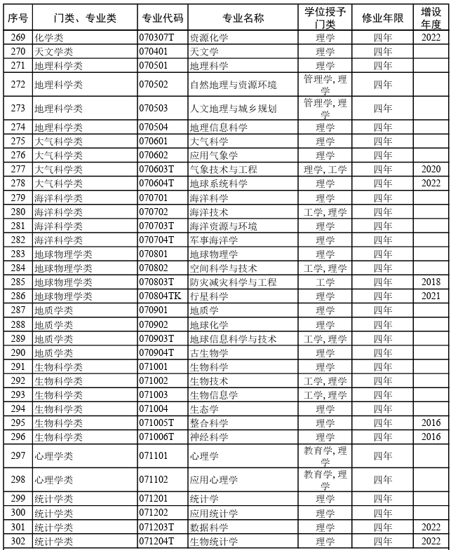 理学门类下设数学、物理学、化学、天文学、地理科学、大气科学、海洋科学、地球物理学、地质学、生物科学、心理学、统计学等。