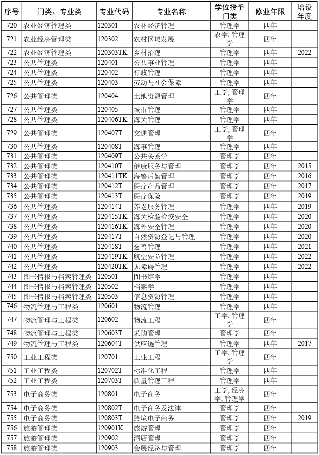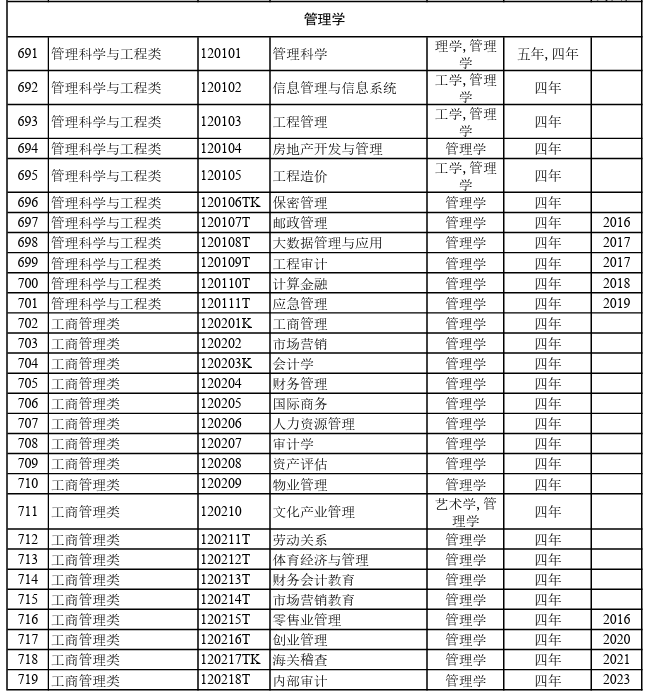 管理学门类下有管理科学与工程、工商管理、农业经济管理、公共管理、图书情报与档案管理、物流管理与工程、工业工程、电子商务、旅游管理等。