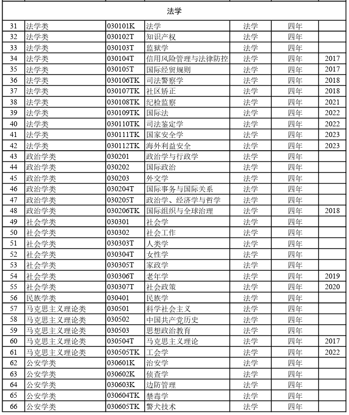 法学门类下有法学、政治学、社会学、民族学、马克思主义理论、公安学等几类。