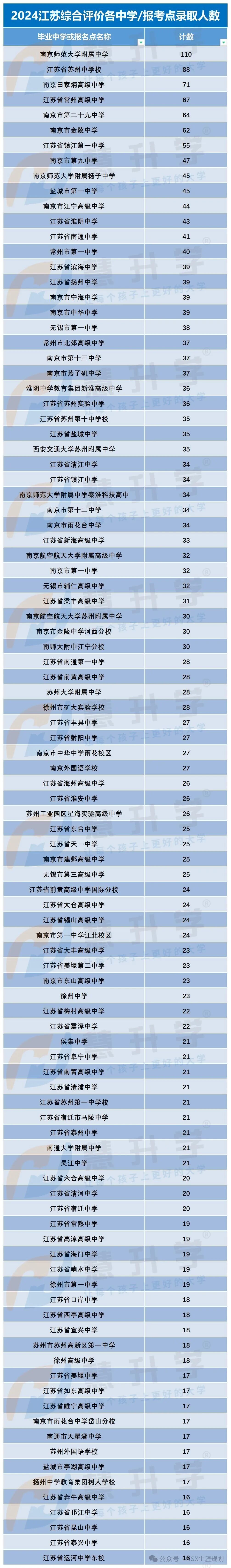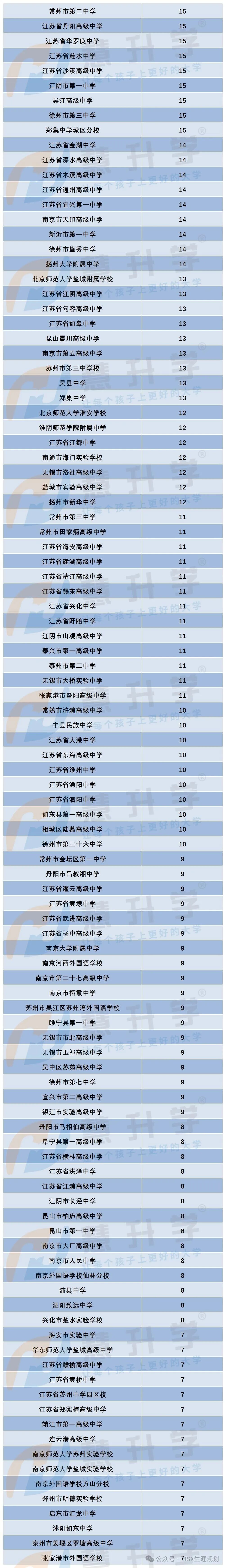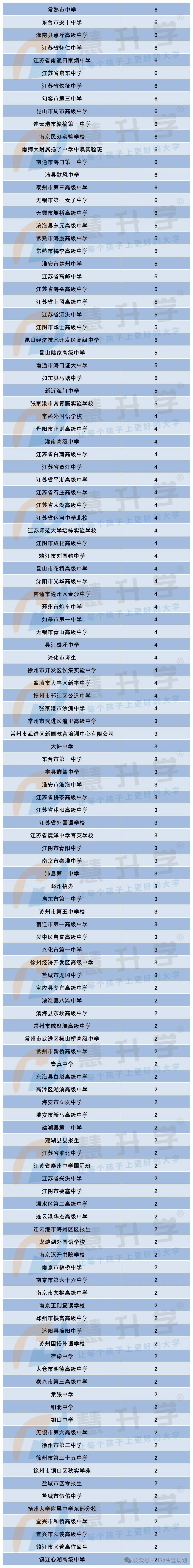 南京师范大学附属中学110人;苏州中学88人;南京田家炳高级中学71人;常州高级中学67人;南京市第二十九中学64人。