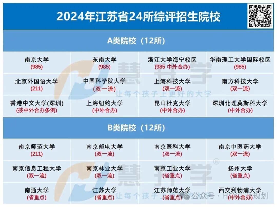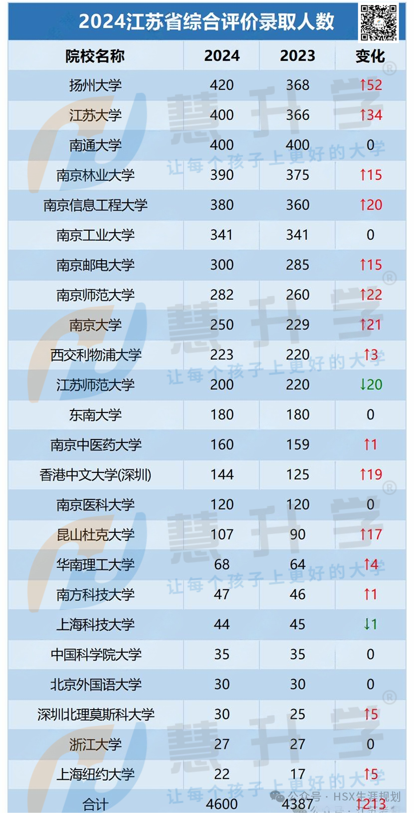 2024年高考有24所院校在苏开展综评招生,今年A类录取984人,B类录取3616人,共计4600人,与去年相比增加213人!