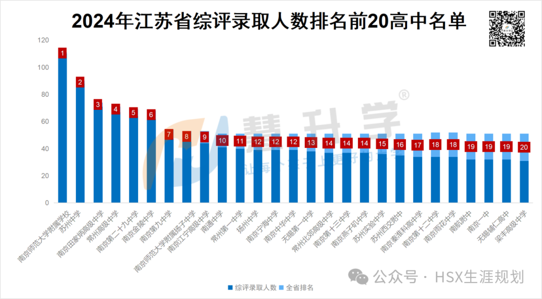 南师附中综评人数依旧排第一,不过与2023年的131人相比,减少21人;苏州中学增长22人,田家炳高级中学增长13人,常州高级中学增长9人,二十九中增长16人。